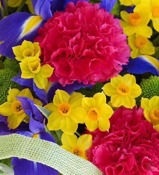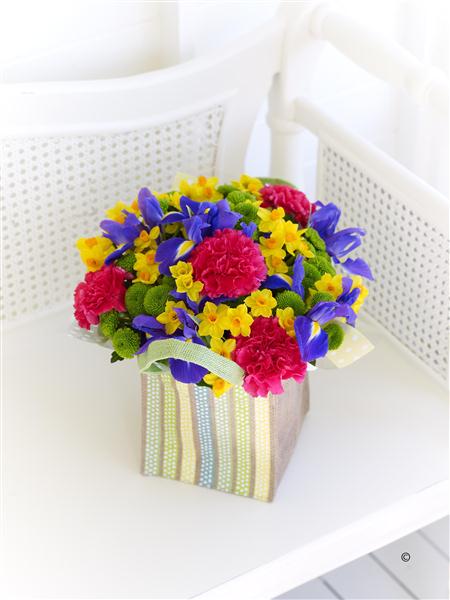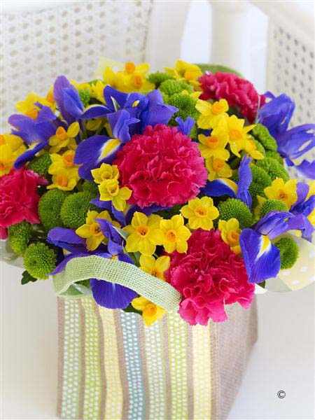 Featuring 4 cerise carnations with 5 blue iris, 9 sol d'or and 3 green spray chrysanthemums hand-tied with salal leaves and finished with spring gift wrap and ribbon. This gift is presented in a striped eco-friendly jute bag.