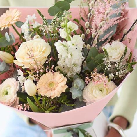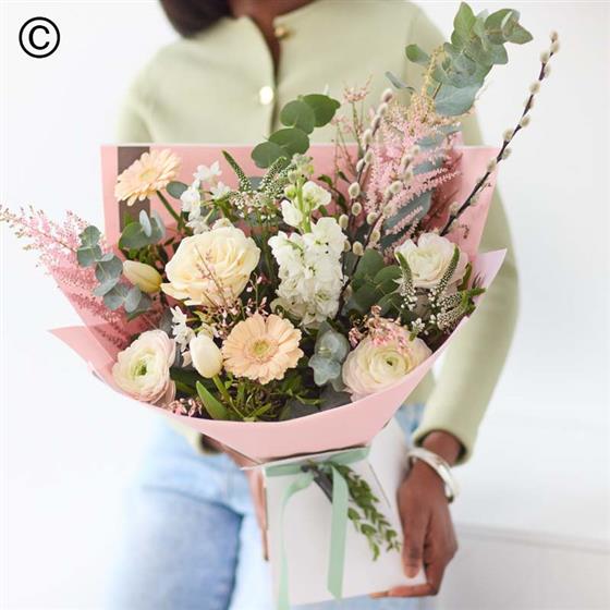 This handcrafted trending bouquet made by a local florist, will feature gorgeous blooms in soft shades, inspired by the spring dawn. Expect shades of peach, dusky pink, lemon and cream, plus dried flowers and foliage.
