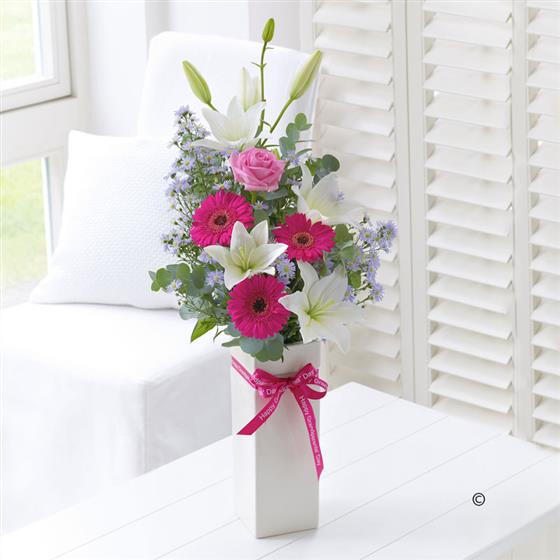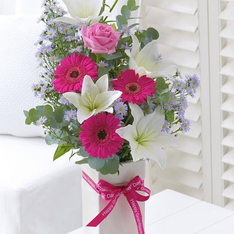 Featuring 2 cream Asiatic lilies, 3 cerise germini, a pink long-stemmed rose and 2 lilac September flowers with eucalyptus presented in an occasion vase and finished with a pink Happy Grandparents' Day ribbon.