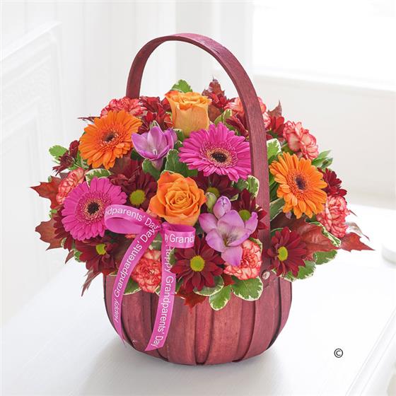 Featuring orange spray carnations, red spray chrysanthemum, orange germini, cerise germini, orange large headed roses and cerise freesia with salal, pittosporum and red oak leaves, presented in a mulberry wash driftwood basket trimmed with ‘Happy Grandparents' Day’ ribbon.