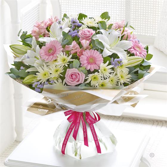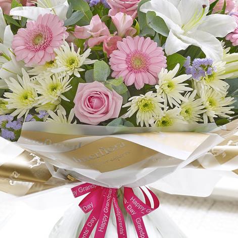 Featuring pink alstroemeria, white Oriental lily, pink large headed rose, white spray chrysanthemums, lilac statice and pink germini with eucalyptus and salal, wrapped and trimmed with ‘Happy Grandparent's Day’ ribbon and presented in Interflora Gift Packaging.