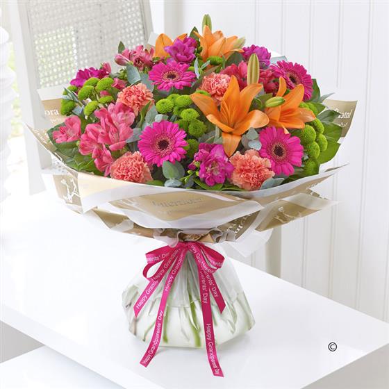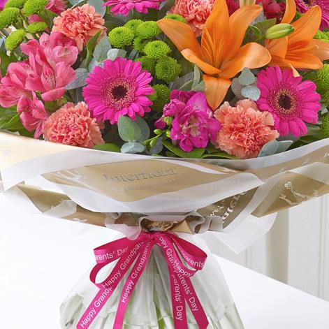 Featuring 3 cerise alstroemeria, 4 orange carnations, 4 green spray chrysanthemums, 4 cerise freesia, 4 cerise germini and 2 orange Asiatic lilies with eucalyptus and salal, wrapped and trimmed with a ‘Happy Grandparents' Day’ ribbon.