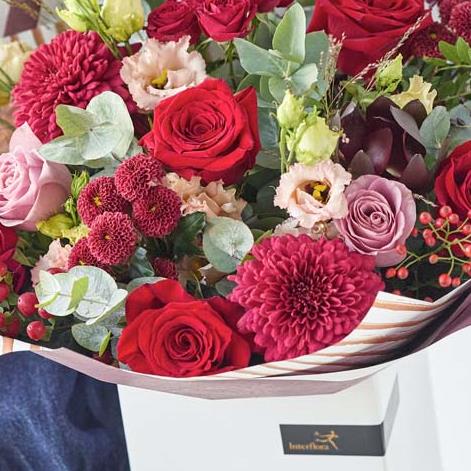 One of our larger Christmas bouquets this handcrafted marvel will feature a wonderful mix of luxurious flowers. It'll feature blooms in shades of red and green, with peach and cream highlights and pops of burgundy and cerise.