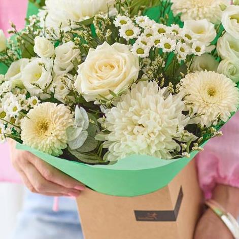 A gift box filled with calming neutral flowers in shades of crisp white and smooth cream, exquisitely arranged with with contrasting fresh green foliage by a local florist.