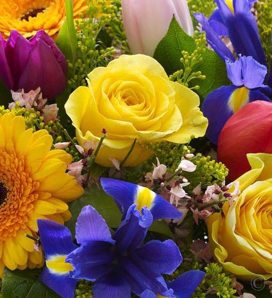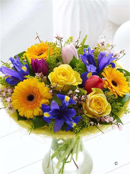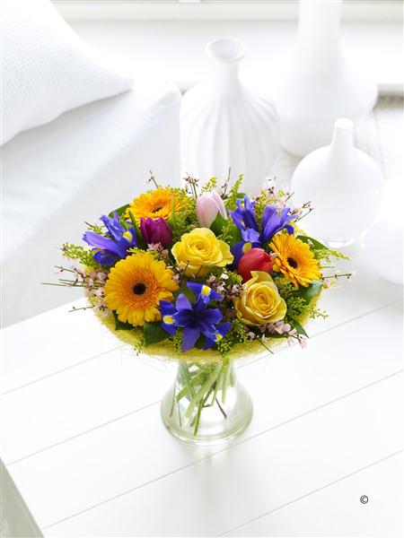 Featuring a large selection of spring flowers carefully arranged in a glass vase with a yellow sisal collar.
