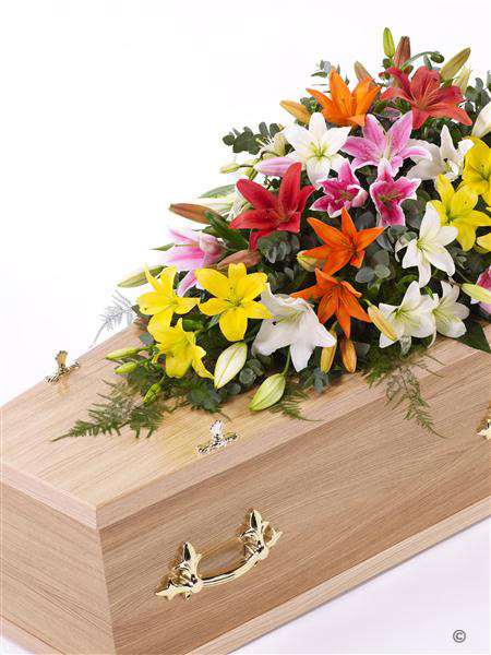 A blanket of Oriental Lily in mixed colours is beautifully complemented by an array of luxurious deep green leaves to create this simple but striking casket spray. Approximate height 122cm (4ft).