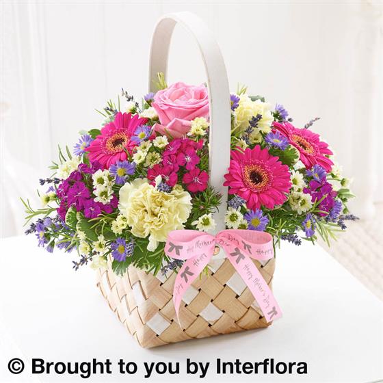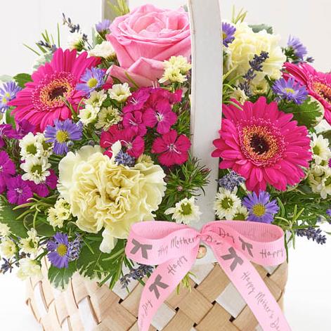 Featuring cream carnations, cream spray chrysanthemum, cerise germini, mixed sweet william, pink large-headed rose and blue September flower with pittosporum, salal, dried lavender and rosemary, presented in a two tone softwood basket trimmed with 'Happy Mother's Day' ribbon.
