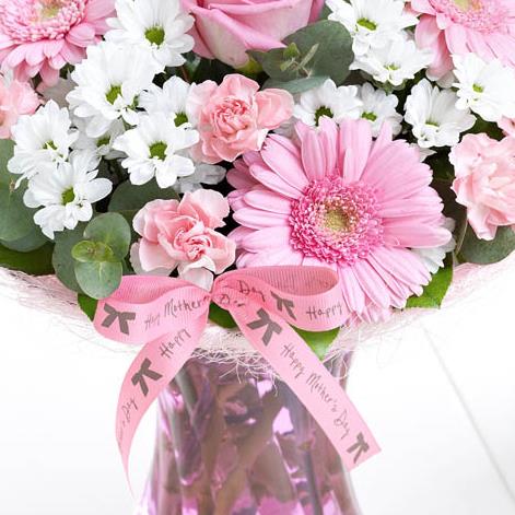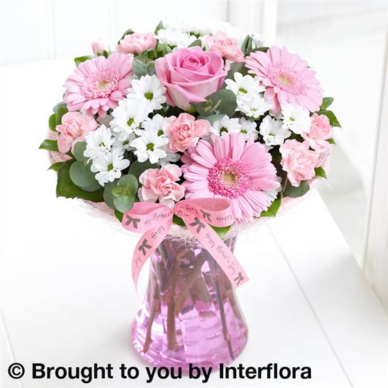 Featuring pink large-headed rose, pink germinis, white spray chrysanthemums and pink spray carnations with Eucalyptus Cinerea and salal in a pink curved glass vase with pale pink sisal collar, trimmed with 'Happy Mother's Day' ribbon and presented in Interflora Gift Packaging.