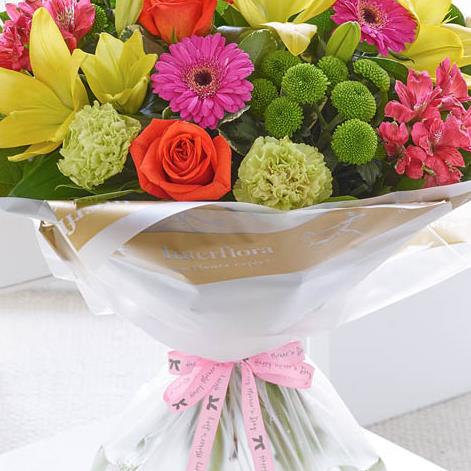 Featuring pink alstroemeria, green carnations, cerise germinis, yellow Asiatic lilies, orange large-headed roses and green spray chrysanthemums with pittosporum and salal, wrapped and trimmed with 'Haoppy Mother's Day' ribbon and presented in Interflora Gift Packaging.