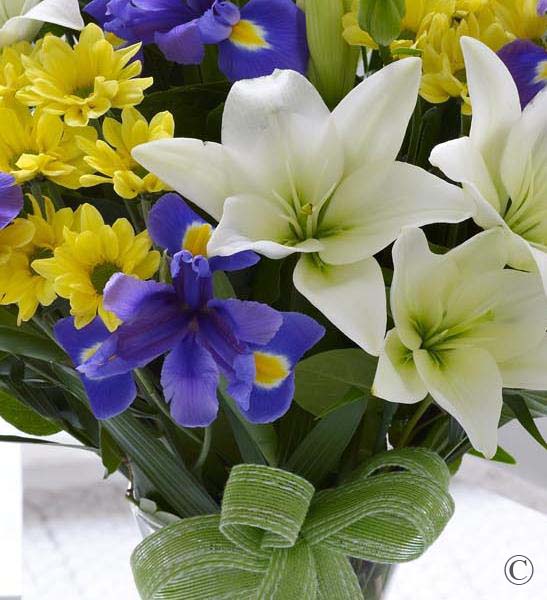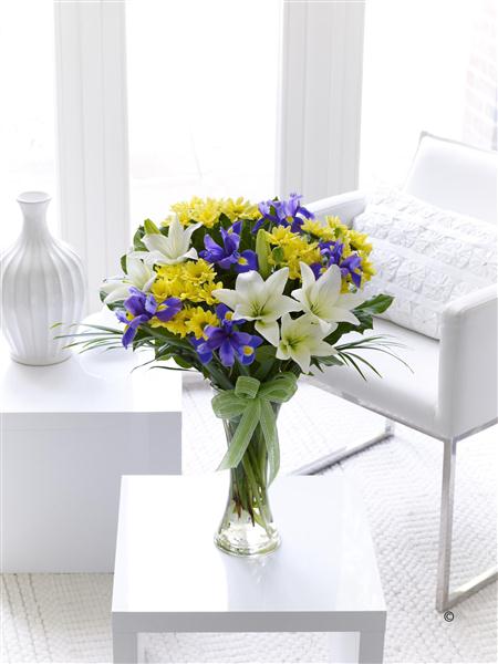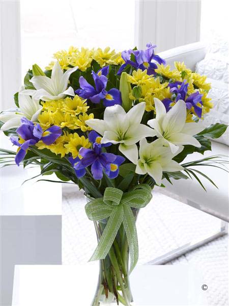 Featuring 2 cream Asiatic lilies, 3 yellow spray chrysanthemums and 5 blue irises with palm leaves and salal, presented in a tall, slim glass vase.