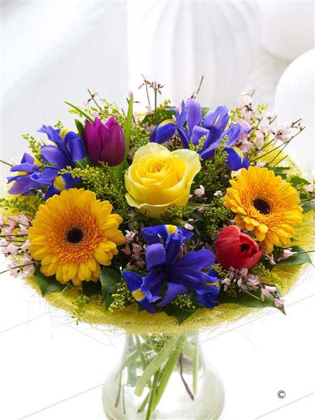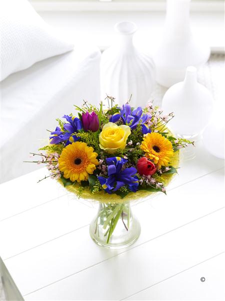Featuring a selection of spring flowers carefully arranged in a glass vase with a yellow sisal collar.